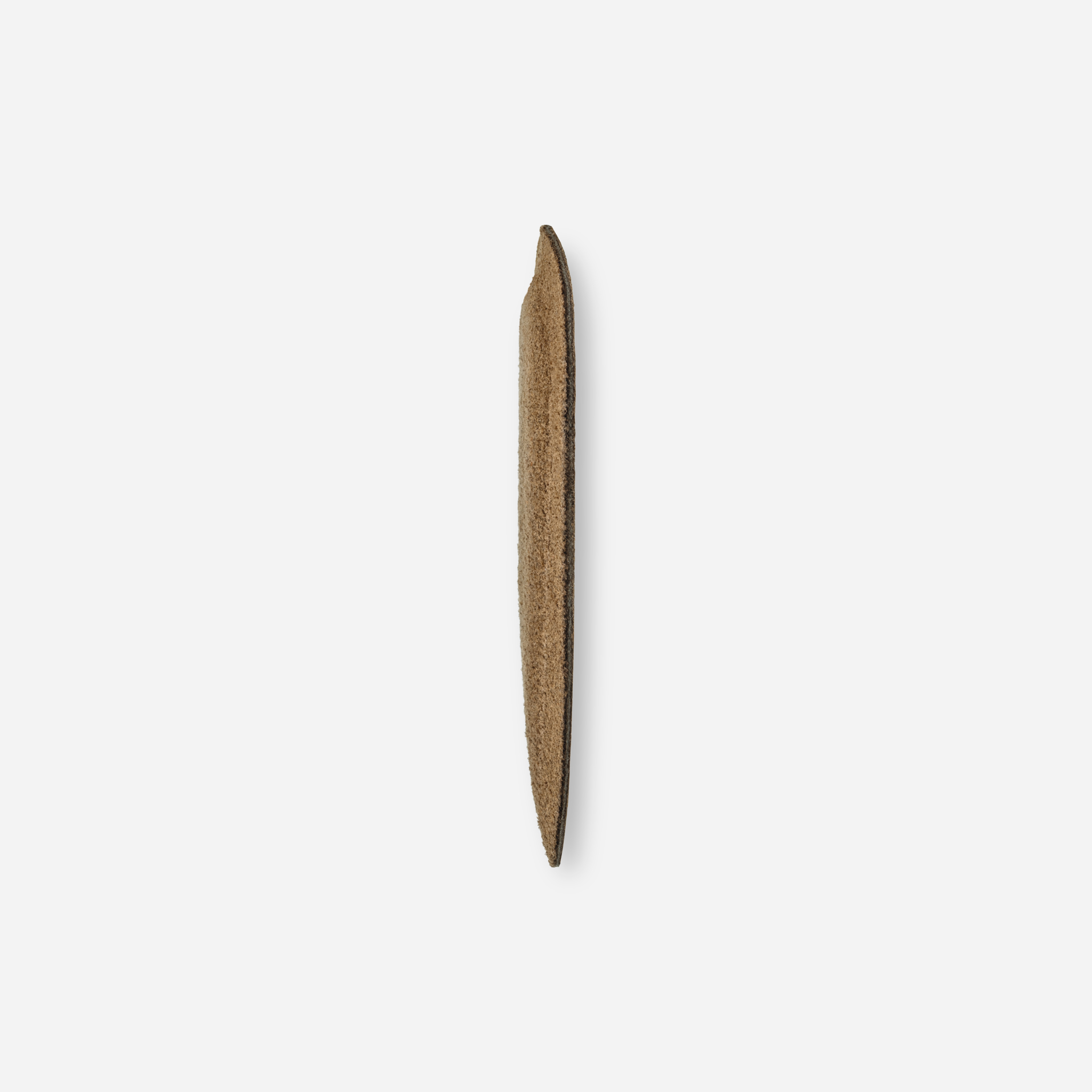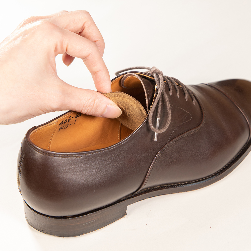 スープラの表面は、肌触りの良い本革スウェードが巻かれています。このスウェードの起毛が、靴の中で足やソックスにしっかりとフィットし、パッドがずれてしまうのを防ぎます。このスウェード巻きは、機能性だけでなく目立ちにくさと高級感のある見た目も魅力の一つです。貼る場所が目につきにくい内側だとしても、靴を脱いだ際など、ふとした時に見えても靴のデザインを損ないません。