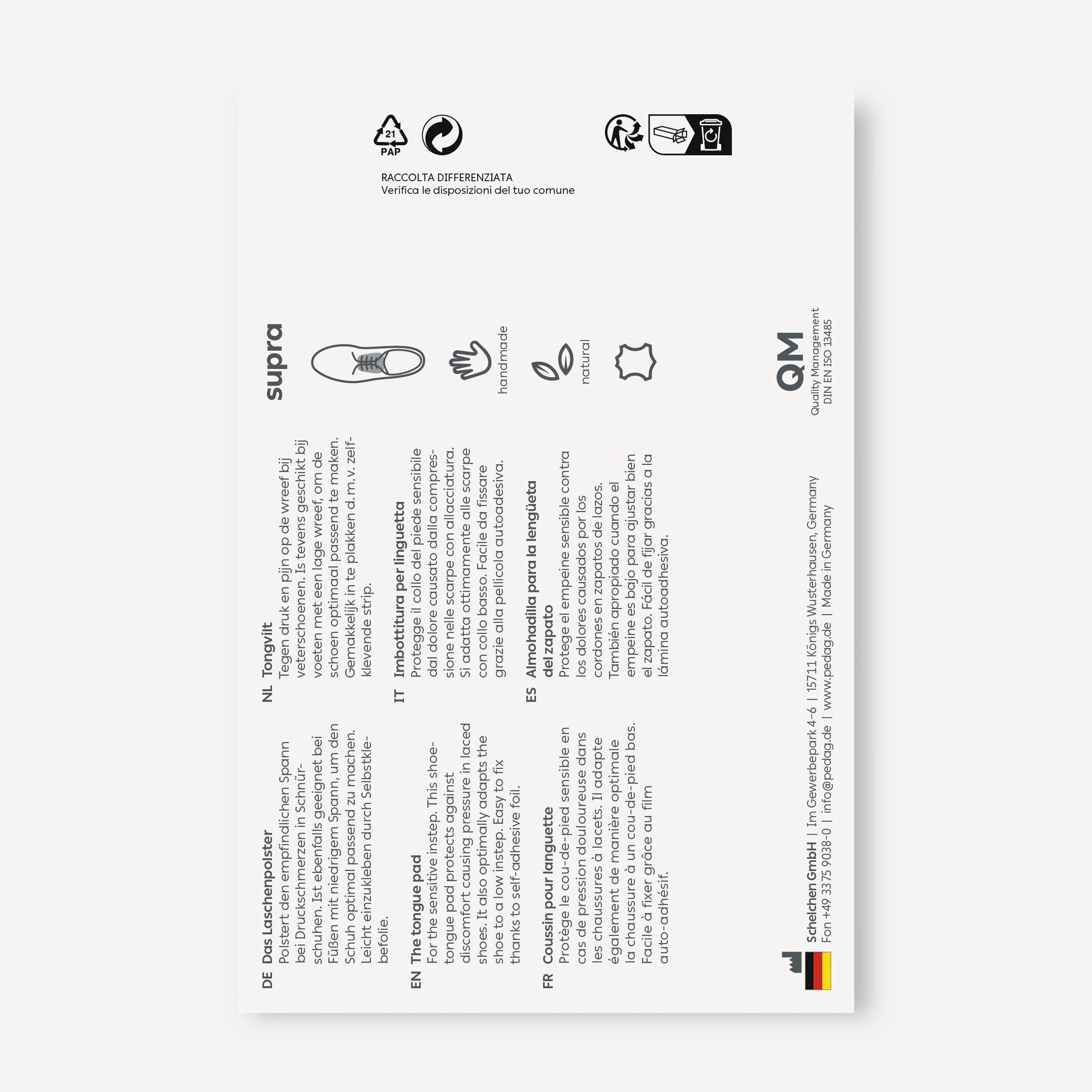 スープラは、靴の甲部分の裏側に直接貼って使います。舌のような形状から、タンパッドとも呼ばれます。このパッドが、靴と足の甲の間に生じた隙間を埋めたり、靴紐などの当たってしまう甲のクッションになってくれます。足に吸い付くように靴のフィット感が向上、快適な履き心地を実現します。