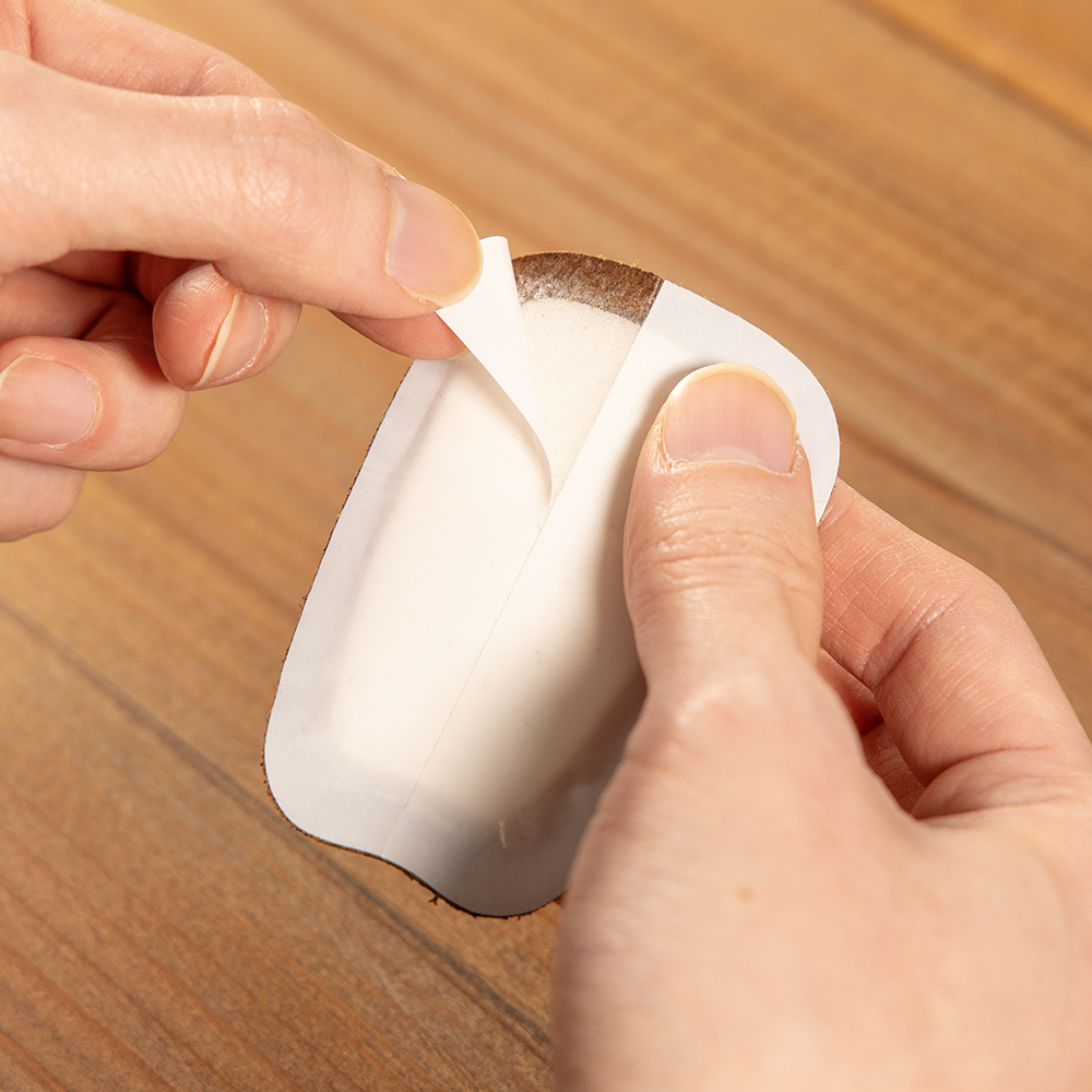 スープラの裏面は全面シールで、はく離紙を剥がすだけで、どなたでも簡単に靴の甲部分に貼り付けることができます。特別な道具や技術は一切必要ありません。