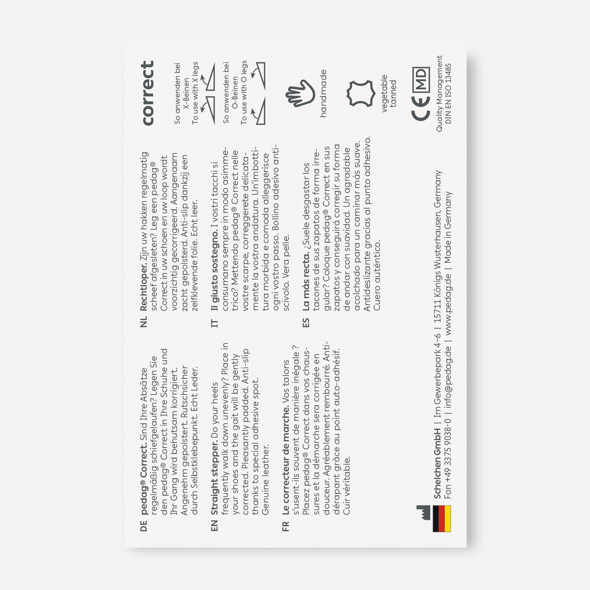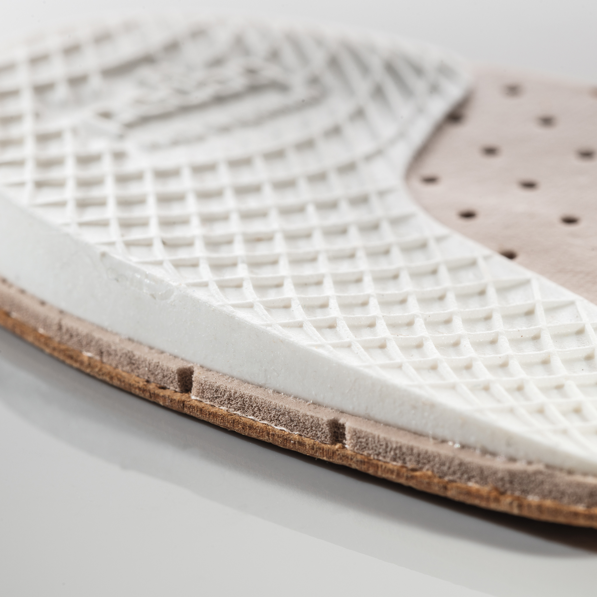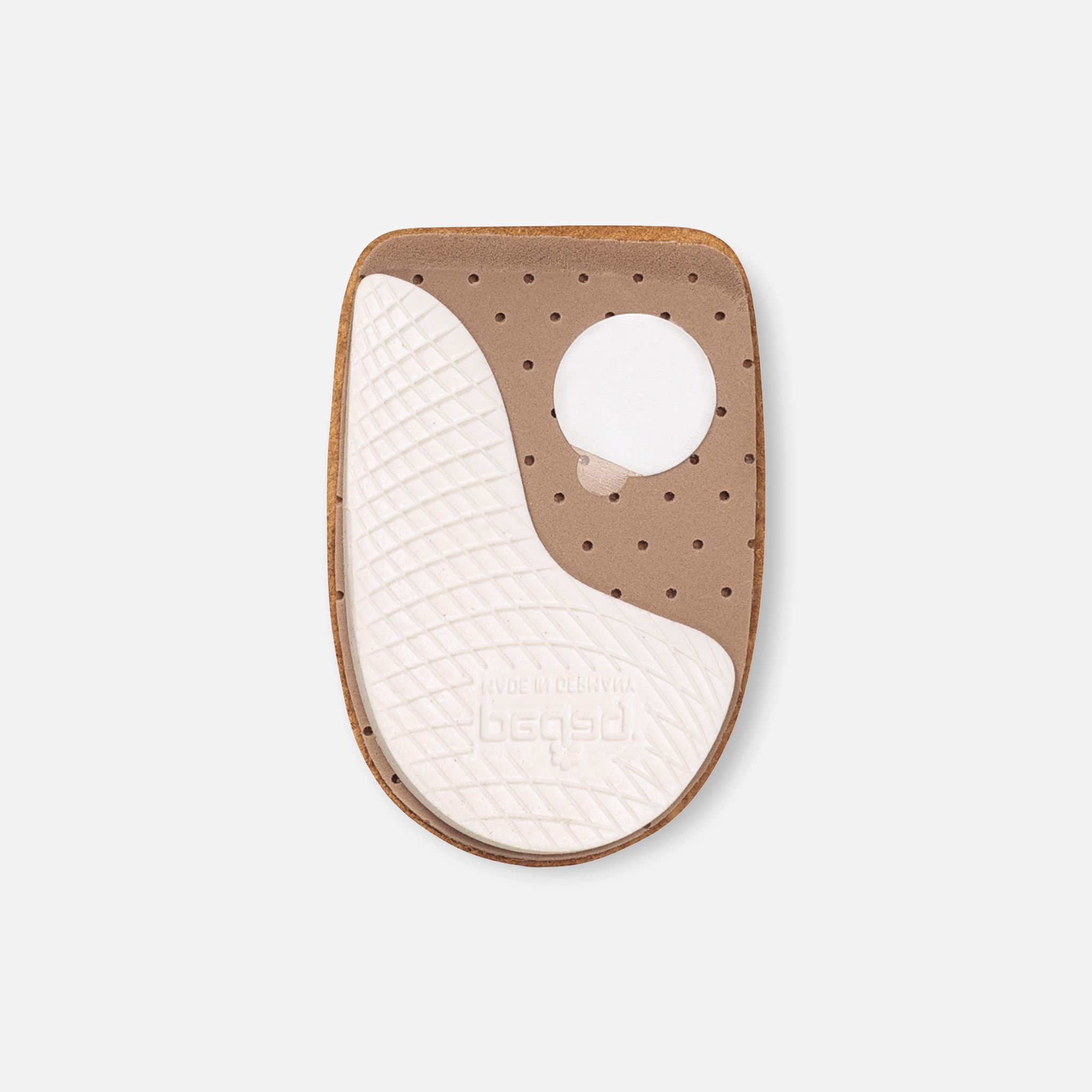 解剖学に基づいて設計された、かかとの片減り予防、O脚・X脚歩行対策インソール。外側を高く、内側を低く傾斜をつけた構造で、外側に偏った重心を自然に内側加重にサポートします(O脚歩行対策に使用される場合)。