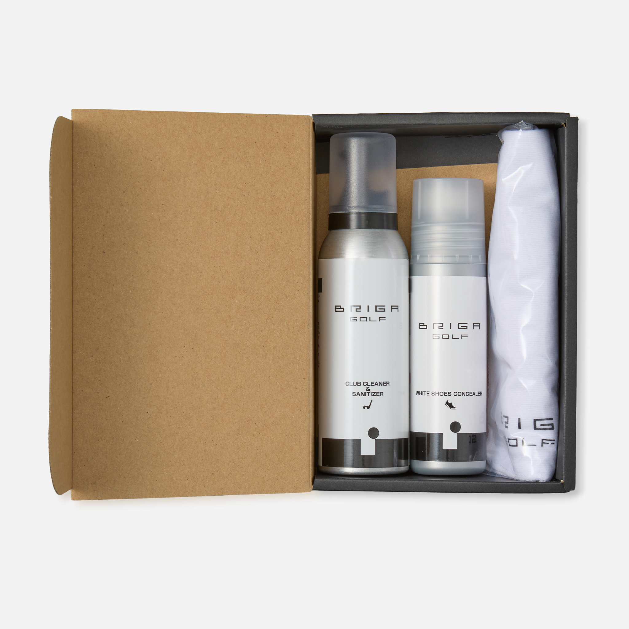 ゴルフシューズを手軽にクリーニングする高密度フォームクリーナーと、白いシューズの気になるキズ・シワの奥に入り込んで落ちない汚れを隠す白革用コンシーラー、専用クロスのセット。