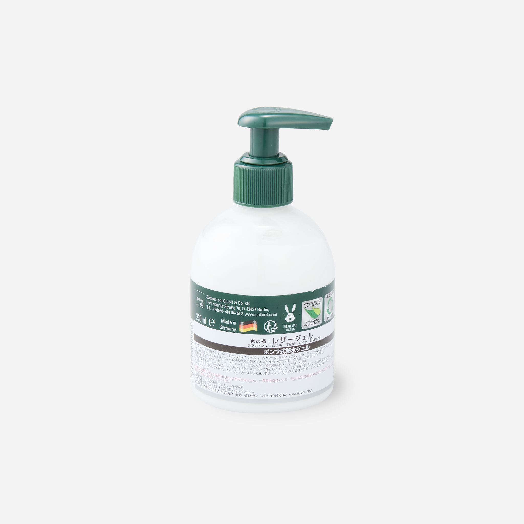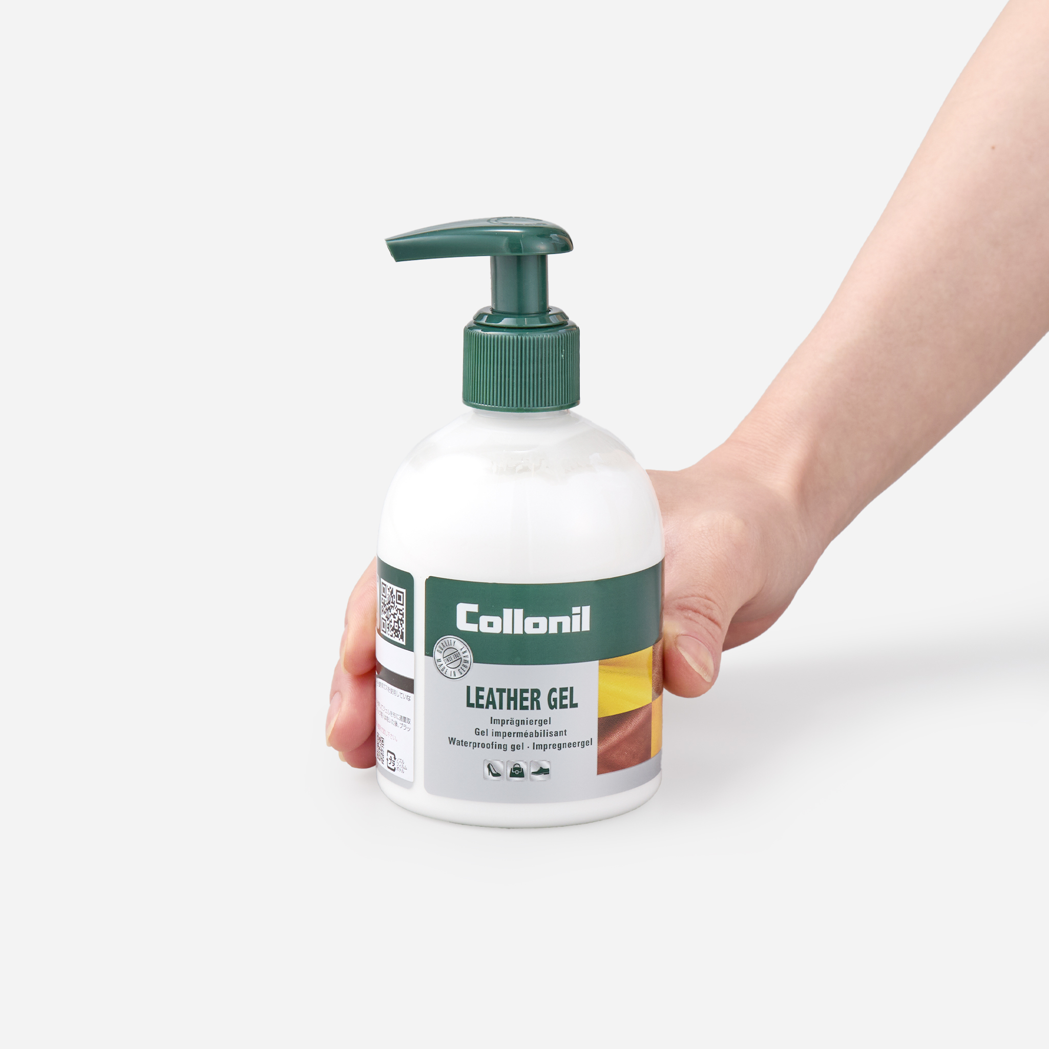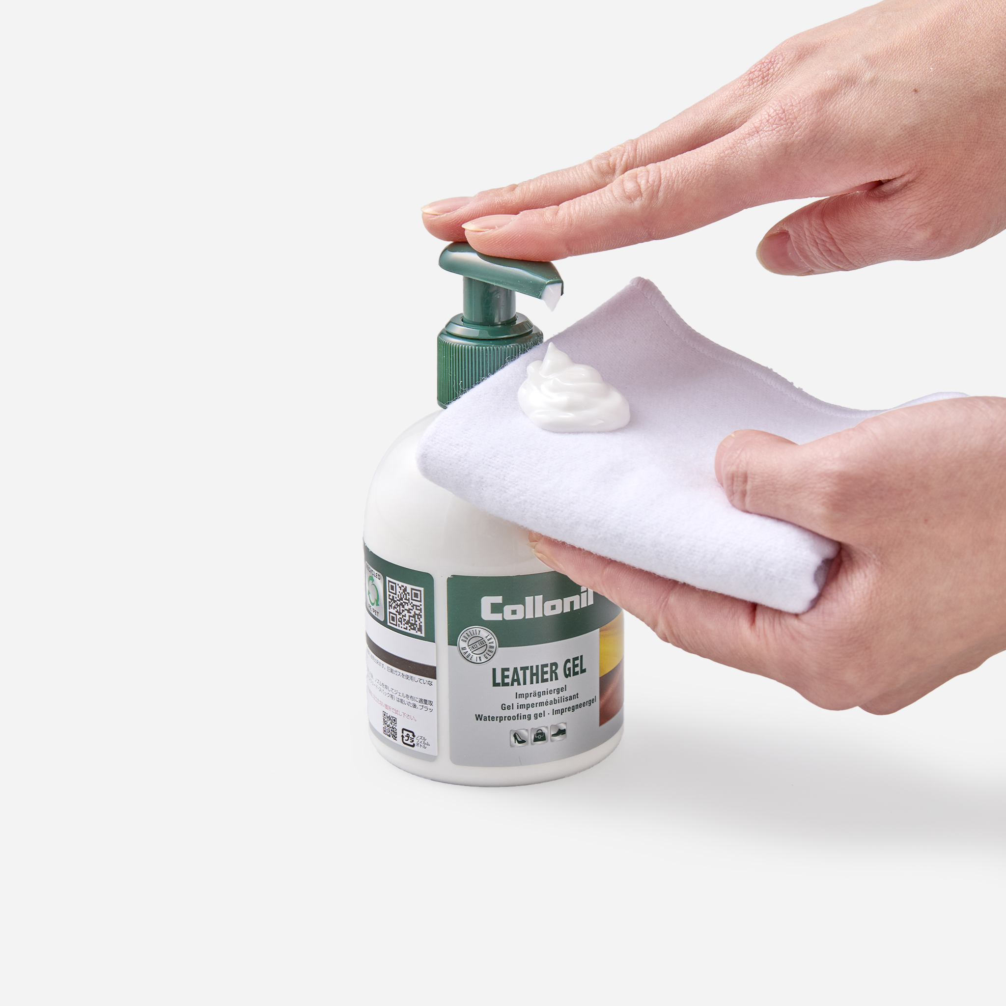 油脂を含むジェルが皮革を水や汚れから保護します。