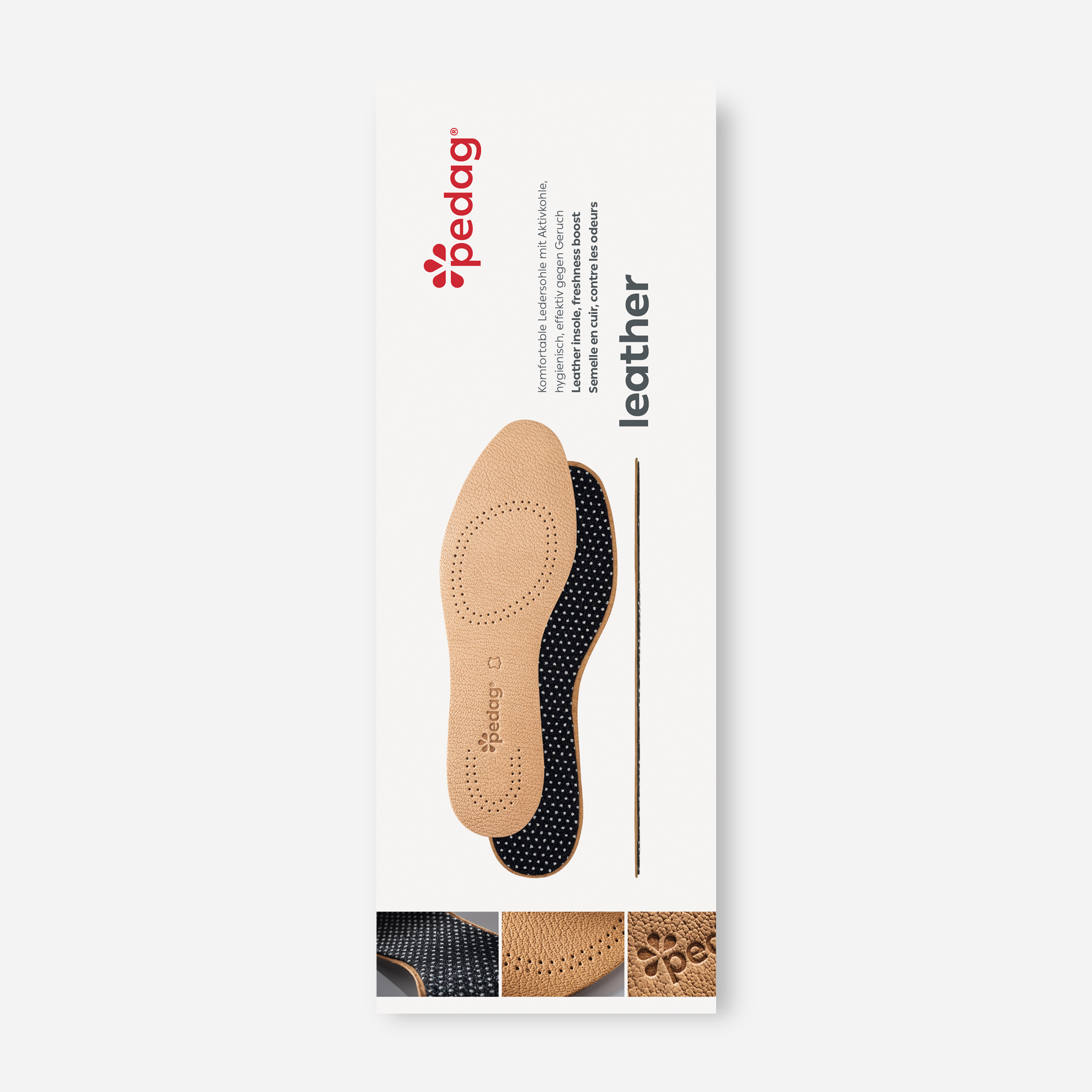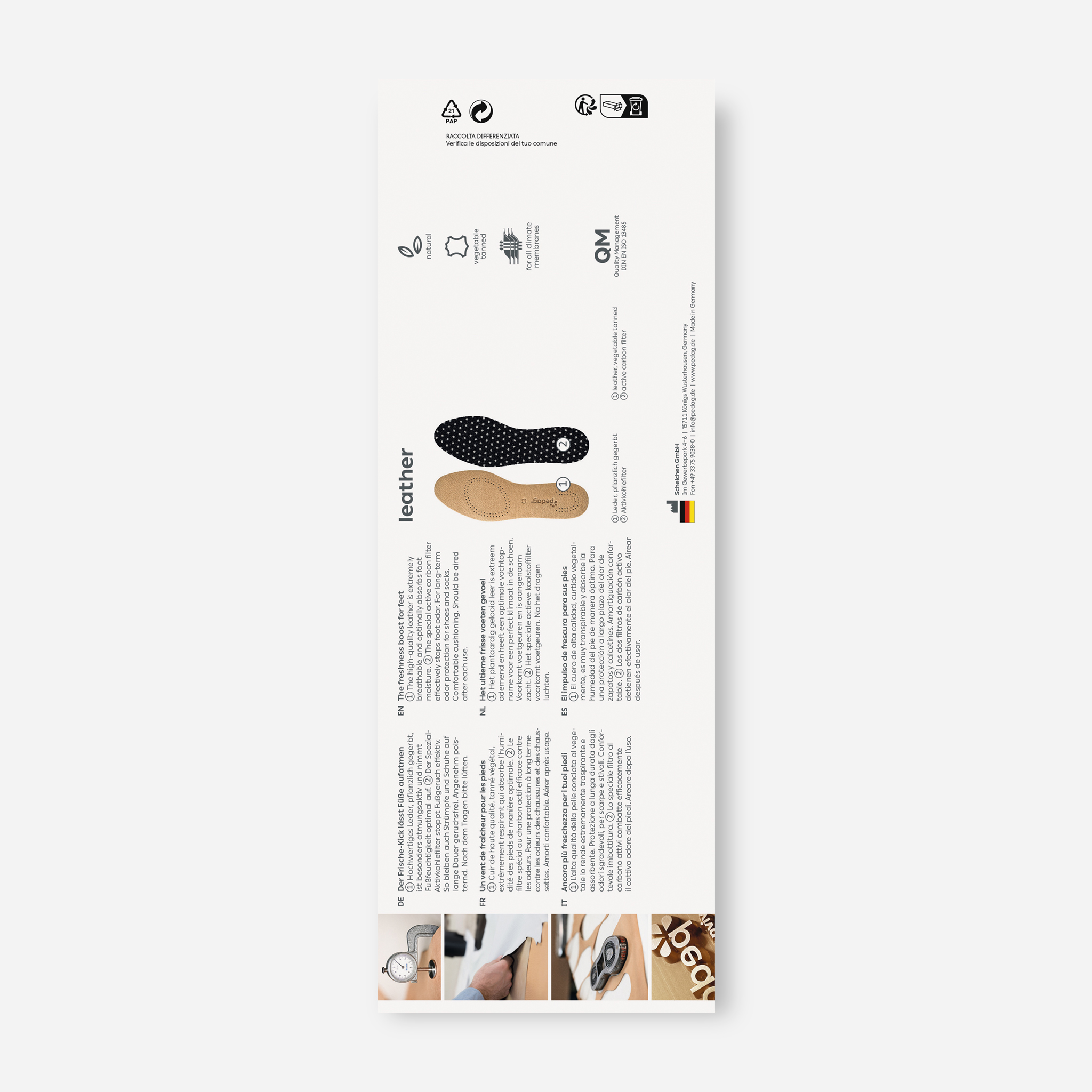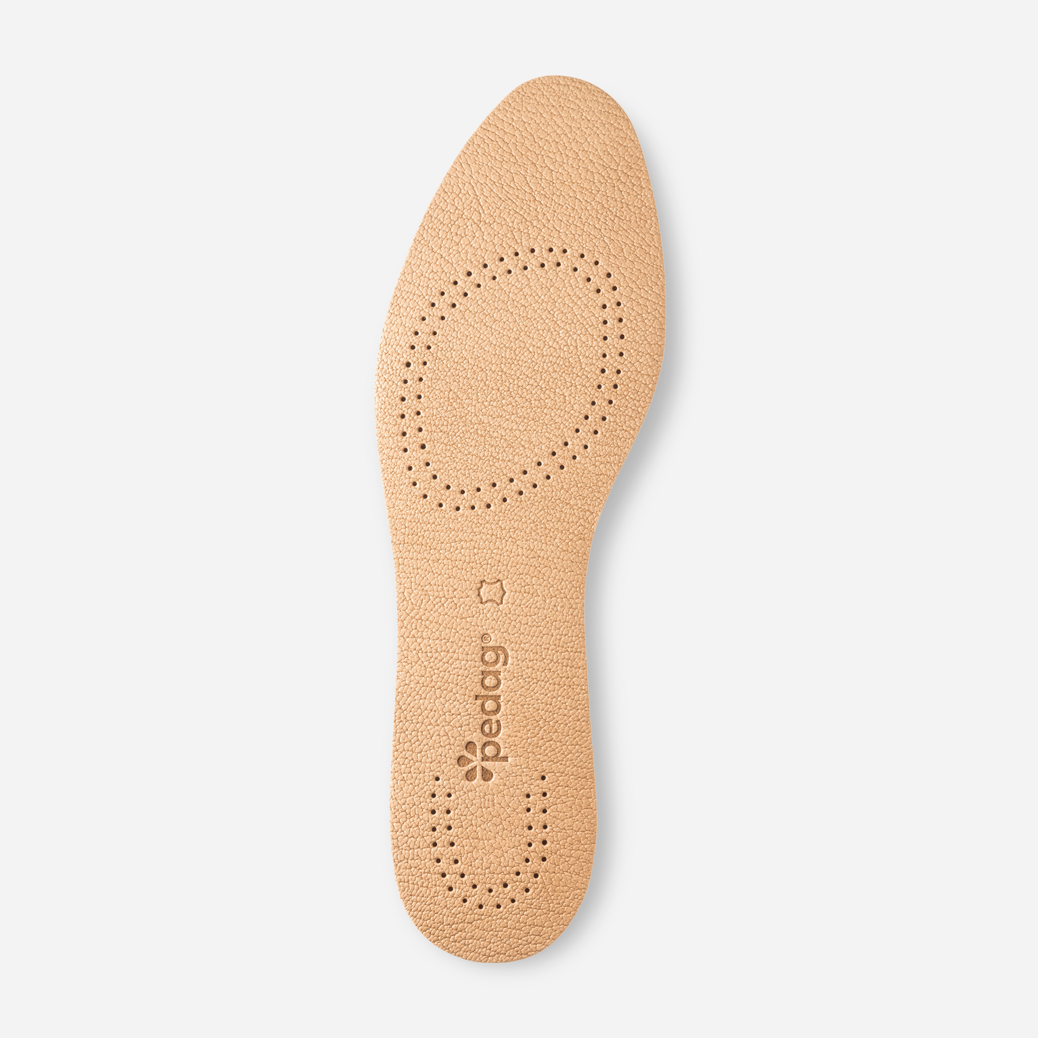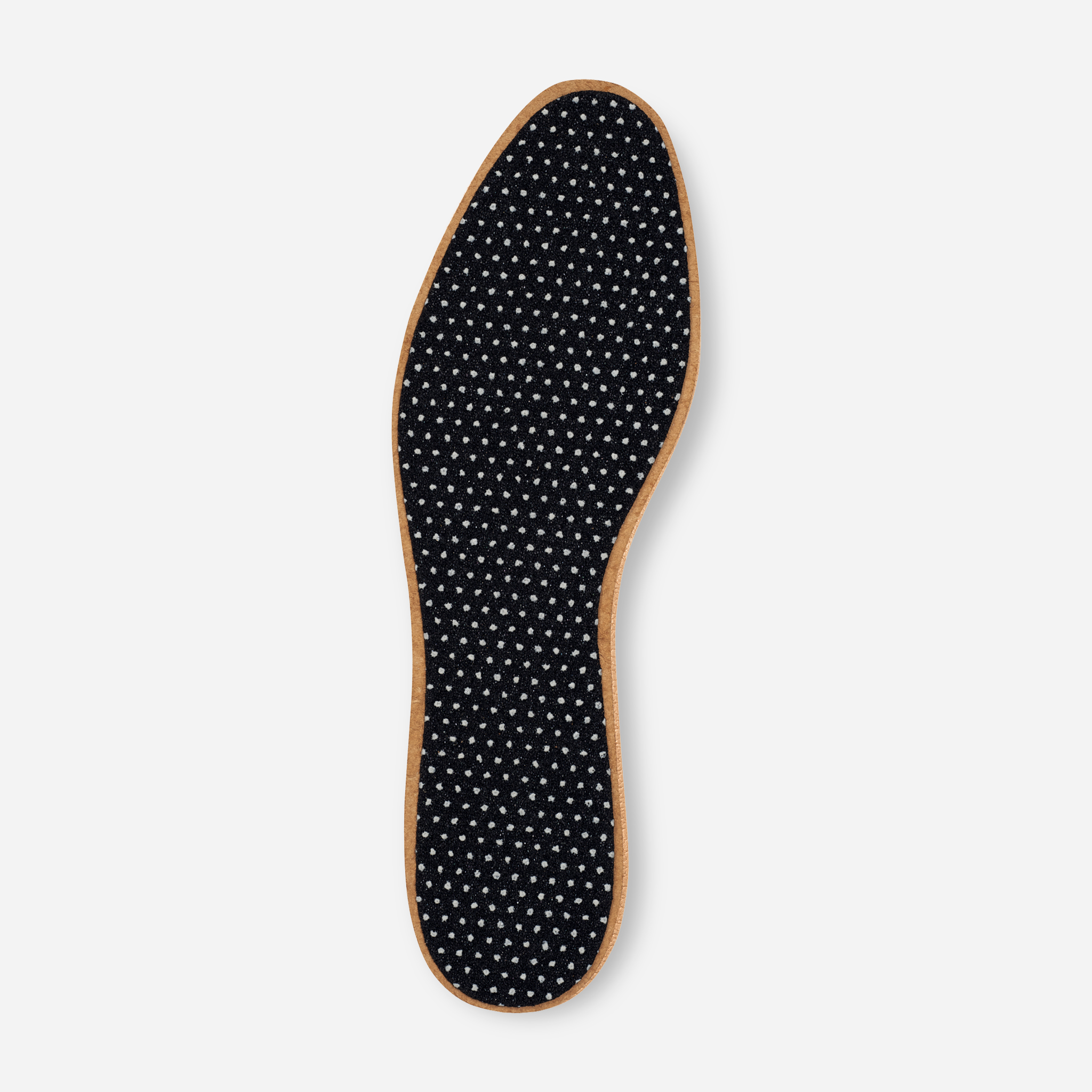 薄いインソールは靴内を圧迫することなく、吸湿性に優れた革がよく汗を吸い取ります。裏面の活性炭フィルターは脱臭効果に優れ、靴内のニオイを抑えます。ビジネスシューズやパンプス等におすすめです。